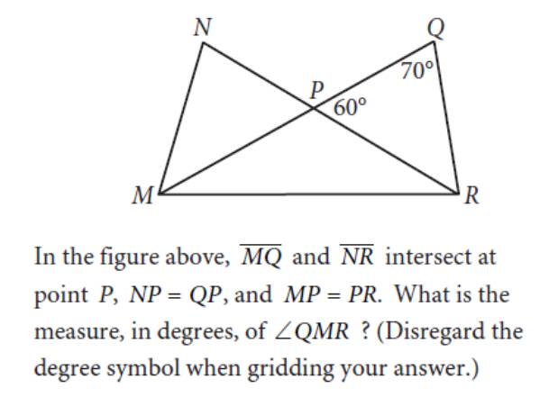 解析:这道题目的很多条件其实并不需要充分利用。在线段MQ上,外角QPR等于不相邻的两个内角(QMR和NRM)之和。与此同时因为MP=PR知道三角形PMR是等腰三角形,且QMR和NRM度数相等,均为30度。因此得到了题目的答案。
